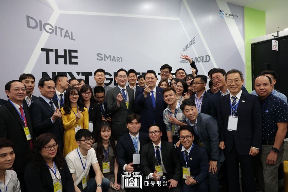 대통령은 '디지털 미래 세대와의 대화'에 앞서, 한국이 설립을 지원한 베트남의 VKIST, 베트남의 SW 인재를 양성하는 Korea IT School, 폴더블폰의 힌지 부품 세계 1위를 점유하고 있는 KH바텍의 부스를 찾았습니다.